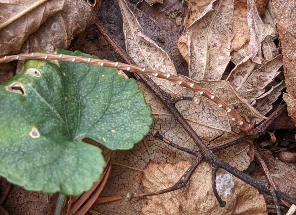 毎年庭の斜面と斜面に近い所にこれが落ちています。何か茶色の短い細い紐に金糸が編み込まれているように見えるものです。これはいったい何なのでしょう?分かる方いらっしゃいますか?…教えて下さい🧐🤔🙏