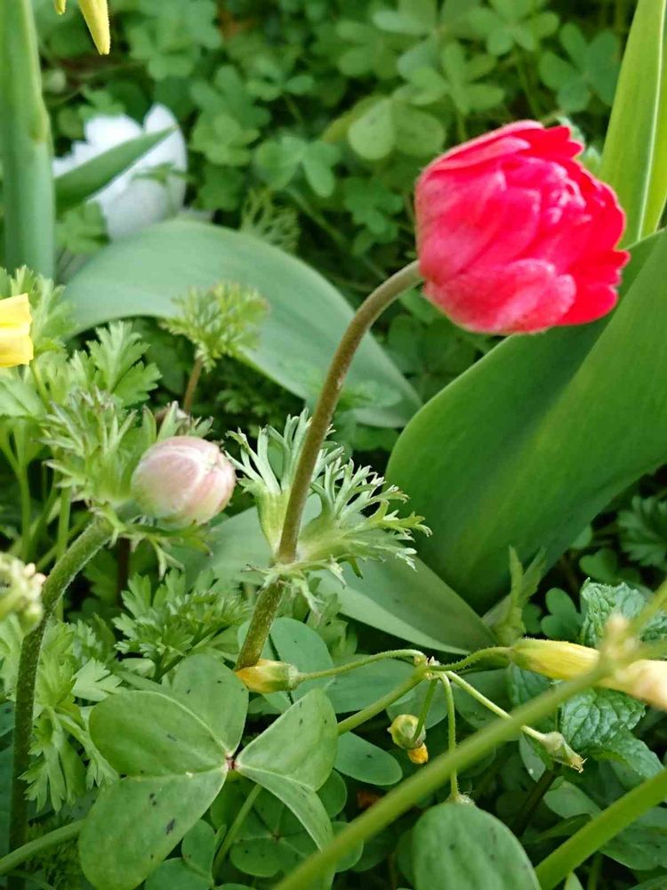 近くにはチューリップの葉っぱらしきものも見えるのですが