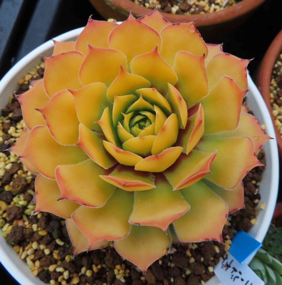 色が変わり続けるセンペルビウムのゴールドナゲット。先月のオレンジ色から濃い黄色に変化した。赤から緑に戻る途中の一時的な色と思うけど,この色もなかなか。葉の奥の方に現れてきた深い赤の部分も気になる。