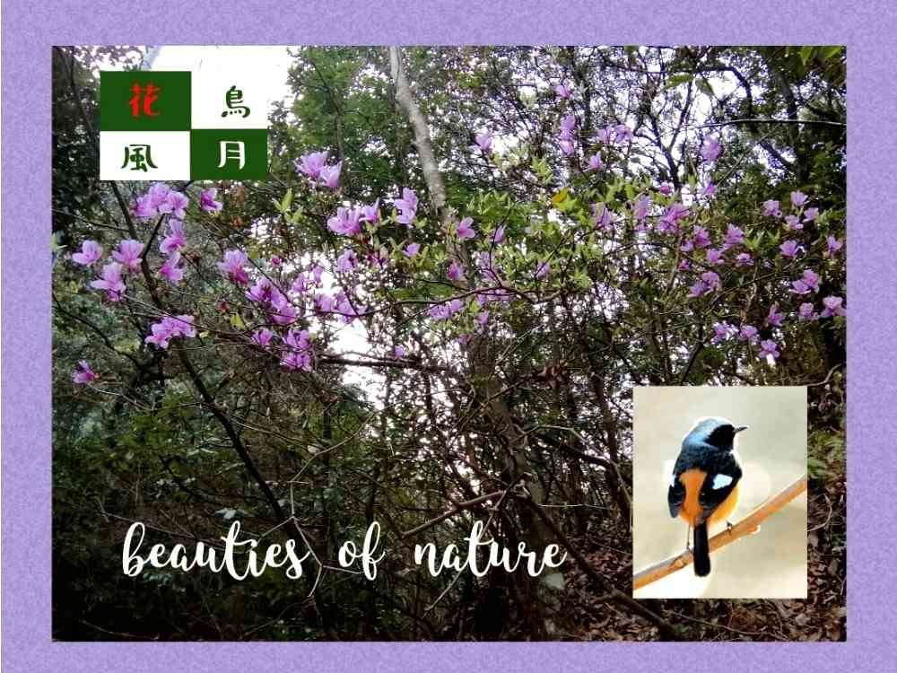 野鳥観察🐦兼ねて自宅の裏山をハイキング🚶。毎年ソメイヨシノ🌸とほぼ同時期に咲くコバノミツバツツジが山の急斜面に少しだけ開花してました。ジョウビタキ♂を発見。