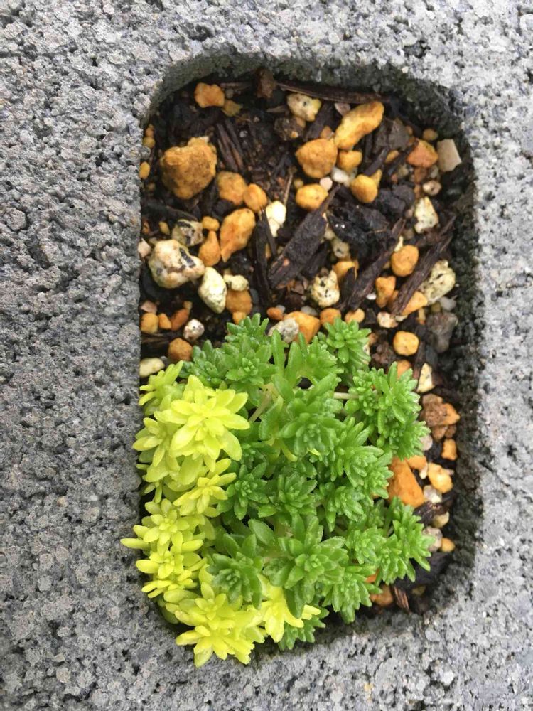 庭の片隅にある家庭菜園コーナーの仕切りとして数ヶ月前にやっとキレイにした(旦那サンにやらせた?)ブロック、何十個使ってあるだろう?、せっかくだから色々植えてみよう!、の穴シリーズ◇