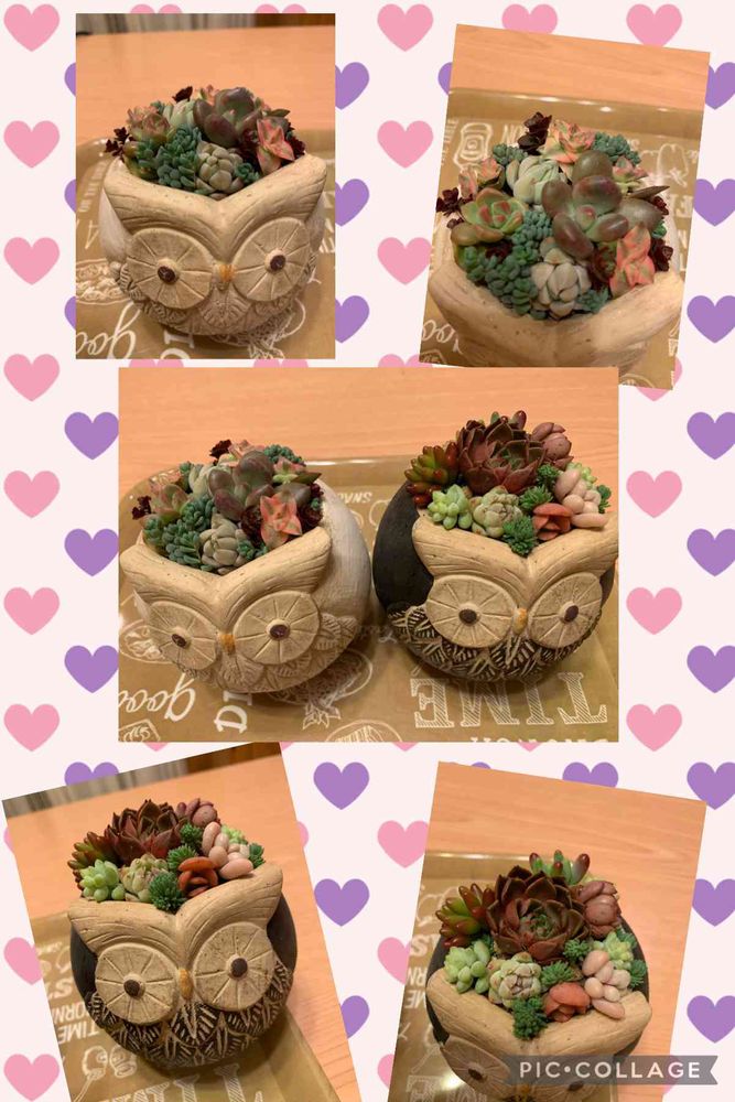 今日は以前買って置いていた色違いフクロウ鉢に寄せ植えしました。
