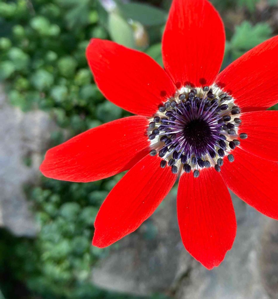 小ぶりで光沢のある鮮やかなアネモネフルゲンス。シベが可愛らしい😆のんびりポチポチ咲きます。