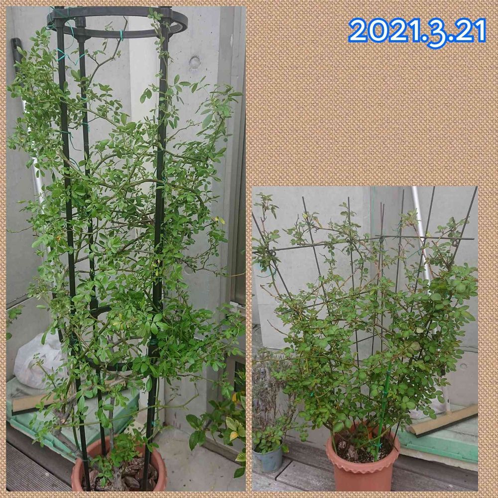 昼前にこの2つを枯れ枝剪定し、伸びてはみ出しすぎているのを誘引というか整えました。両方まだ蕾無しです。