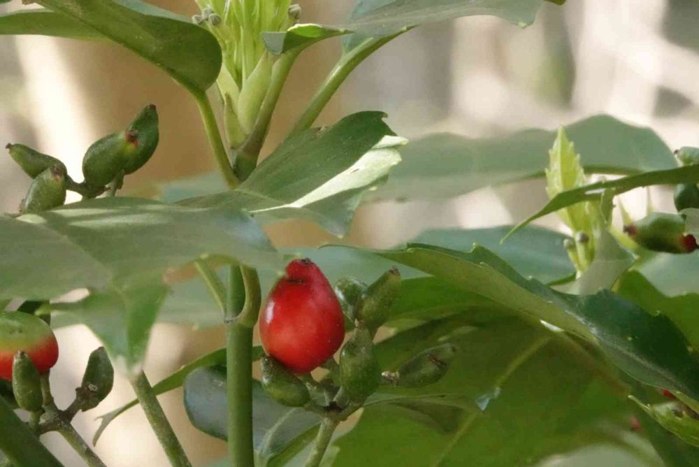 アオキの雌花と雄花を見たばかりですが、冬に出来るはずの赤い実があります。