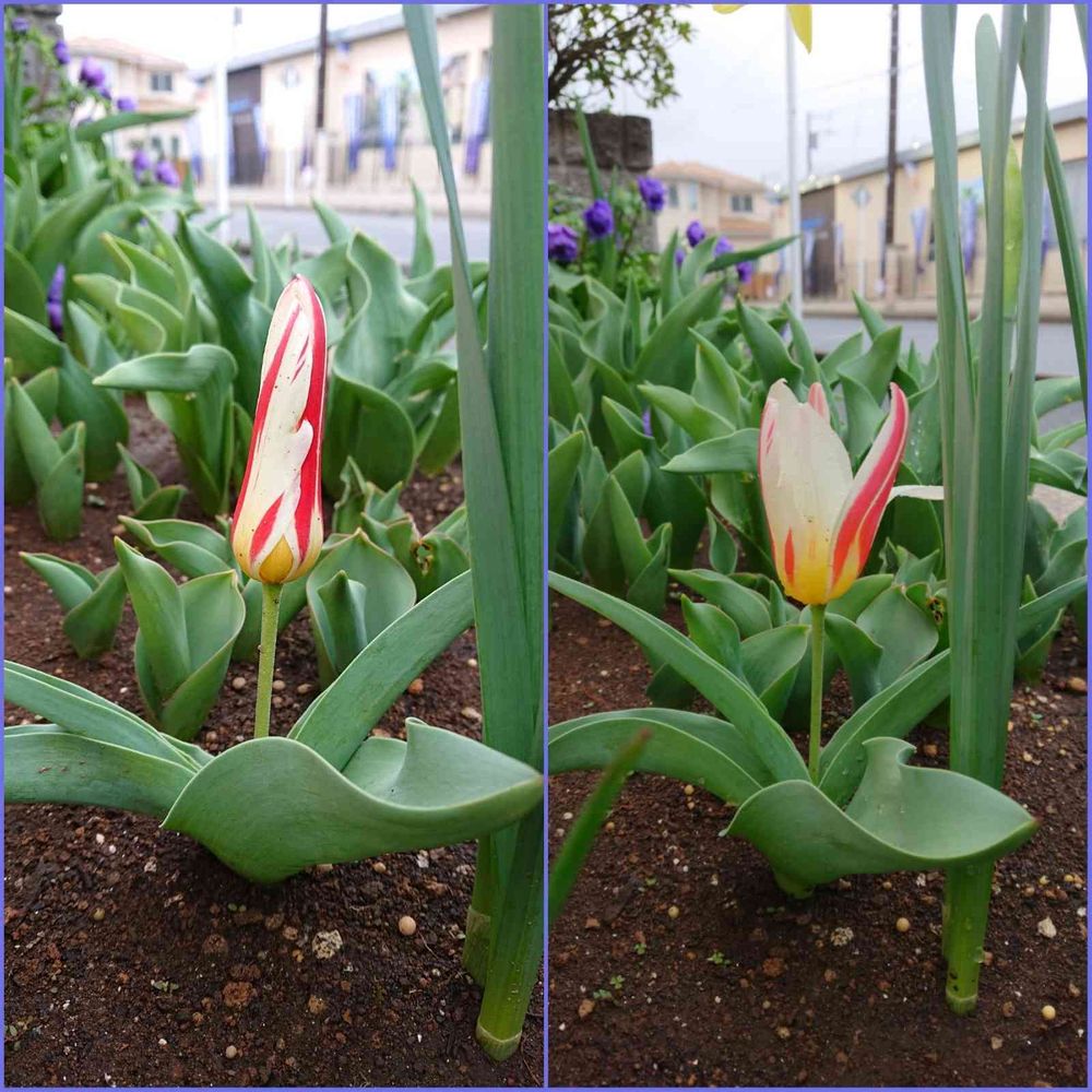 ずんぐりチビッ子チューリップ🌷。可愛い❗でしょ。雨でも少し花を咲かせました❣️。