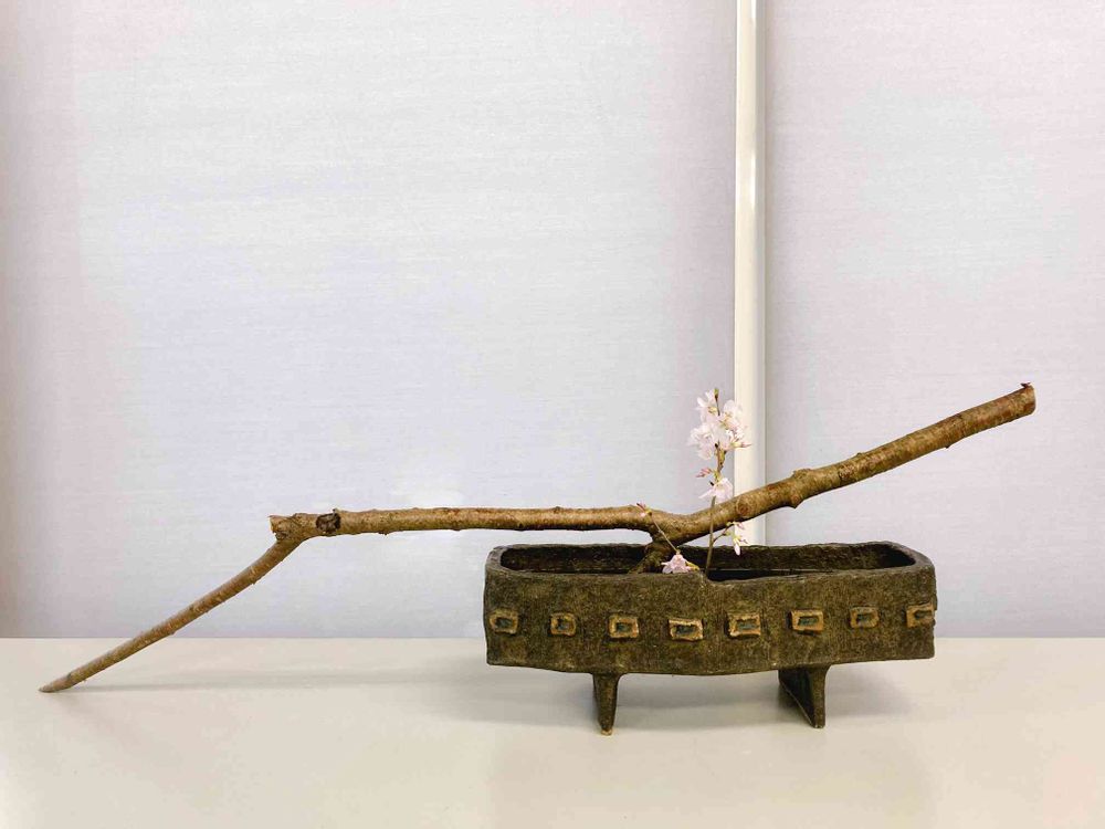 桜の力強い枝を活かす為に試行錯誤し、先生方のアドバイスを聞き、完成した作品。桜の力強い枝と、優しい花を入れて、潔く。