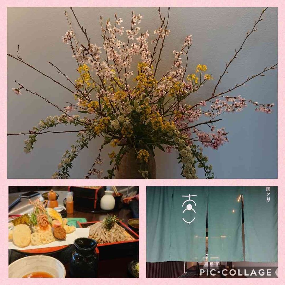 夫の実家のお墓参りに行った帰り 関ヶ原の お蕎麦屋さんに寄って 暖簾をくぐって 自動ドアの先に この生け花を 眺めて🥰 イチオシの天ざるを 堪能😀