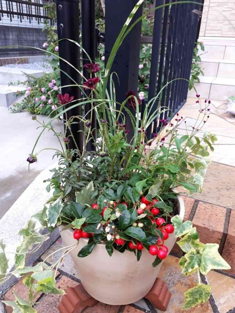 門扉前に秋の寄せ植えを置きました