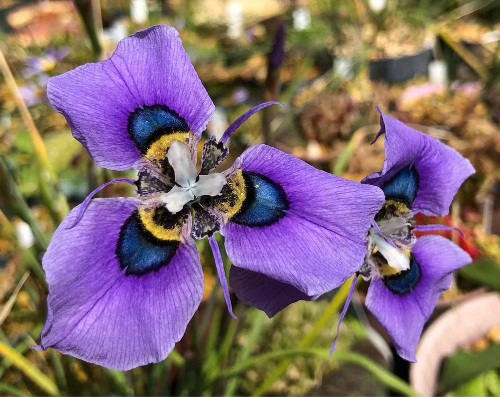 モレア(モラエア)ギガンドラとモレア(モラエア)ビローサの交配種が咲きました💜。クジャクの羽模様が目を引きます❣️。