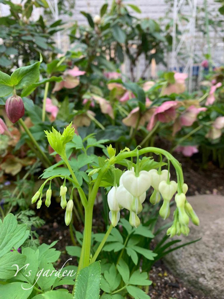 ディッセンドラ(タイツリソウ)も咲き出しました。昨年から育てていて、今年は少し大きな株になりました。ピンクも2株、別の場所で咲いています。