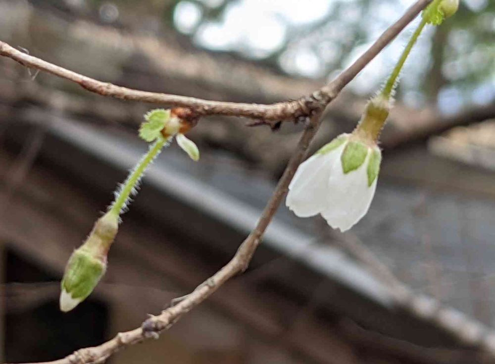 庭の細かい白花の富士桜がきれいに咲いています。下枝の開きかけたお花と蕾を漸く写せました。