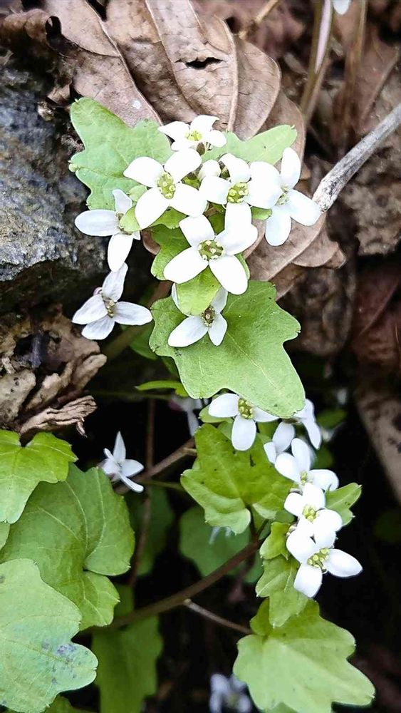 アブラナ科ワサビ属の多年草。山地の谷沿いや湧水地に生える。葉をもむとワサビのような香りを放つ。根生葉は卵円形または腎円形で、基部は心形、波状の鋸歯があり、無毛。茎葉は小型で互生する。花期は2~5月。長さ10~30㎝の花茎を株際から何本も出して、径約8㎜の白い十字花をまばらに咲かせる。長角果は長さ1~1.5㎝。