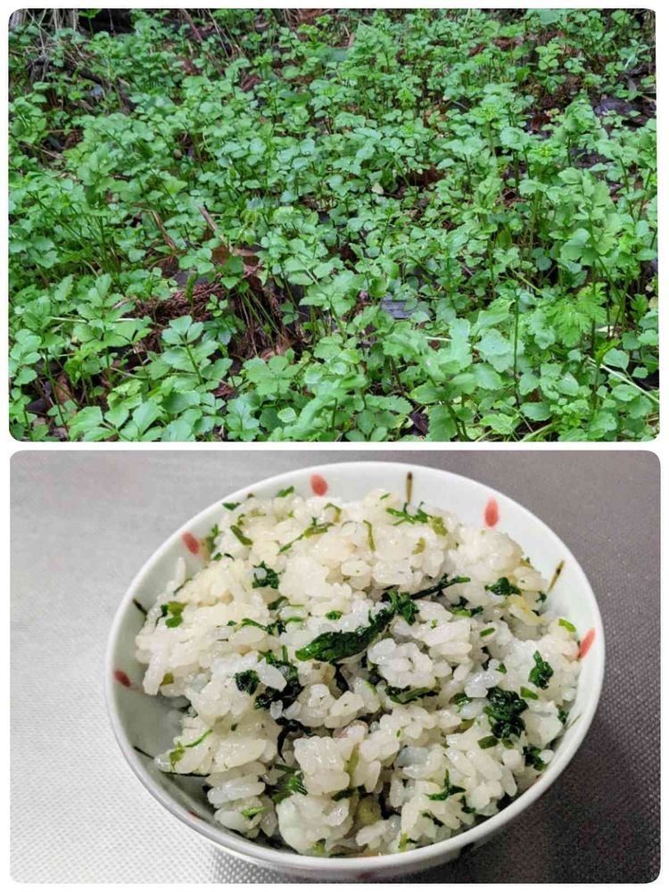 昨日の里山お散歩で摘んだセリでセリご飯を作りました。
