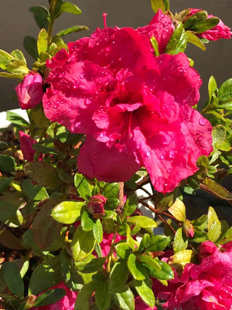 おはようございます アザレアさん!家に来て2年目太陽を浴びてキレイに咲いたね〜風にまけないでね!がんばれ