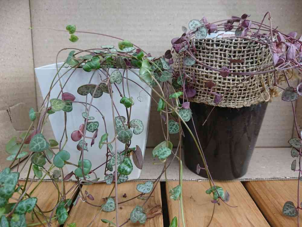 左は室内東側のキッチンの窓辺で毎日見てるから元気だけど紅葉はしてないハートカズラ