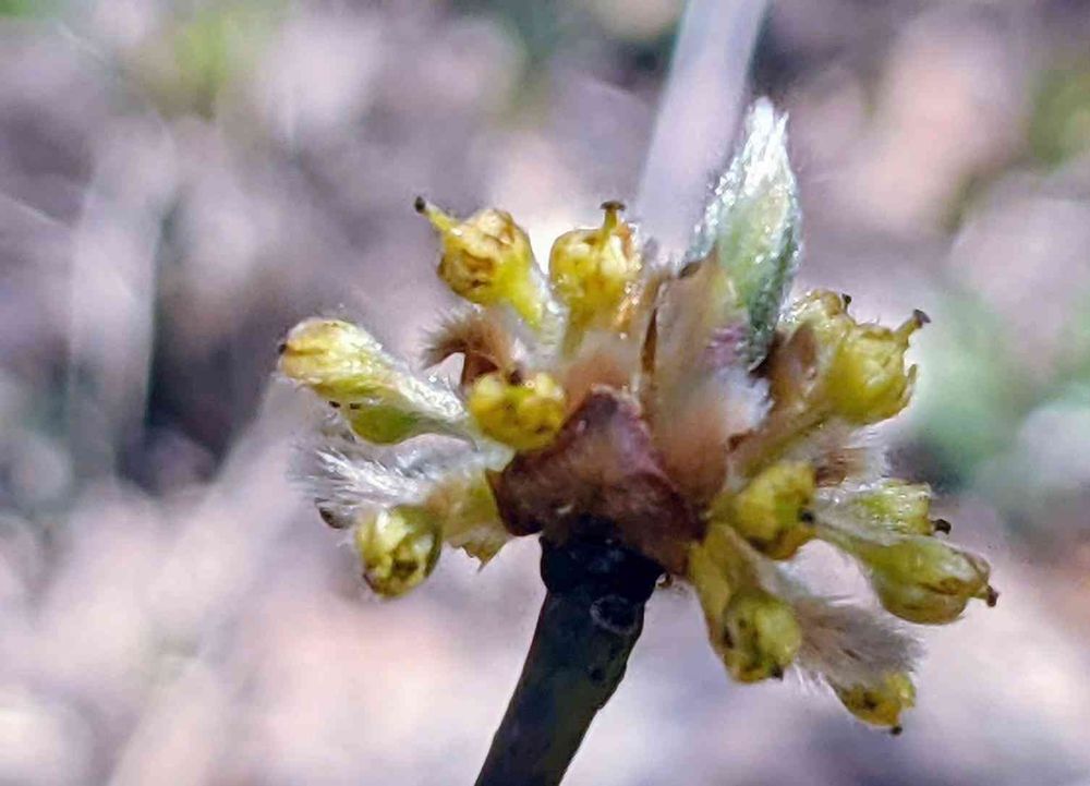早春の花・檀香梅も満開を迎えると、小さなお花の集合体の中から葉が立ち上がって来ます。…クロモジと同じ様に高級楊枝に使われるそうです。