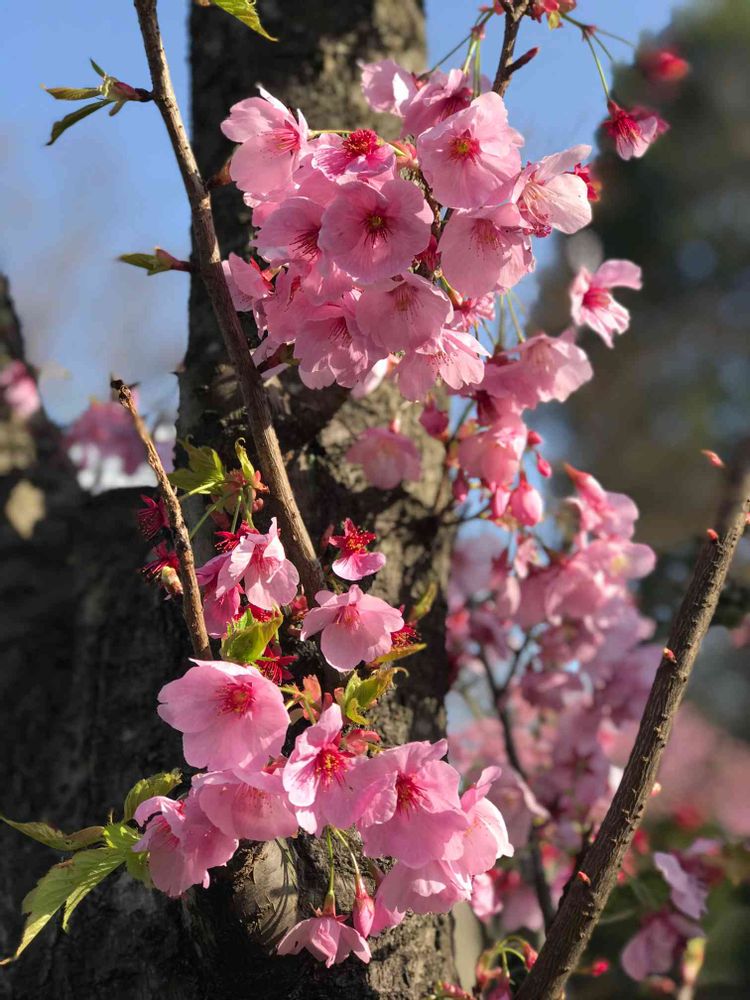 陽光桜(ヨウコウザクラ)は、「天城吉野(アマギヨシノ)」と「寒緋桜(カンヒザクラ)」との交配により生まれた、鮮やかな紅紫色で一重咲きの桜🌸