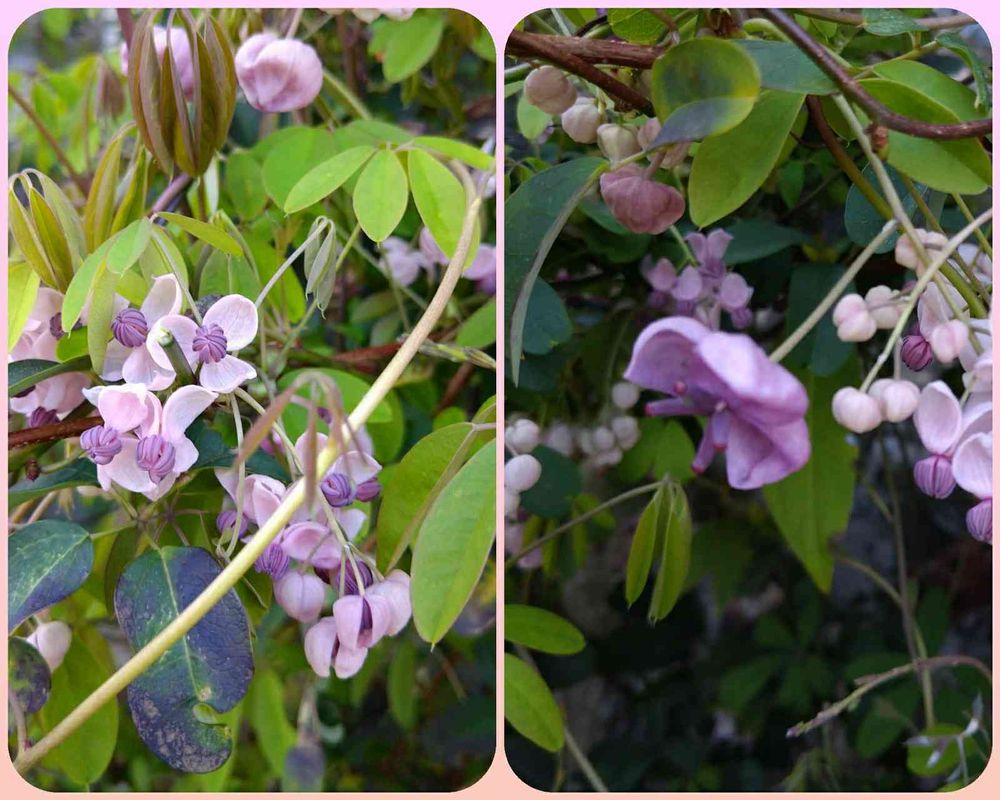 今朝投稿した💜五葉アケビ💜に雄花、雌花があることを教えていただきましたので、撮れていないかなあと探したところ、雄花よりも大きなお花だと思われる雌花がありましたので、コラージュしてみました🤚