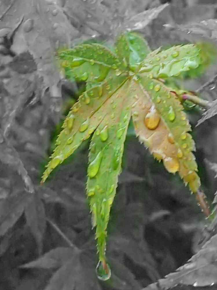 雨降りの1日でした。モミジの緑がモノクロの世界で明るかったので、そのイメージを出してみました。