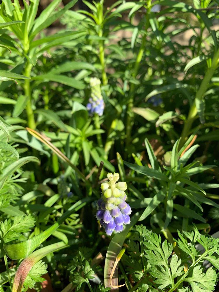 ボーダー花壇に置いた鉢の🪴中から、ムスカリ オーシャンマジックが顔を出しています☺️