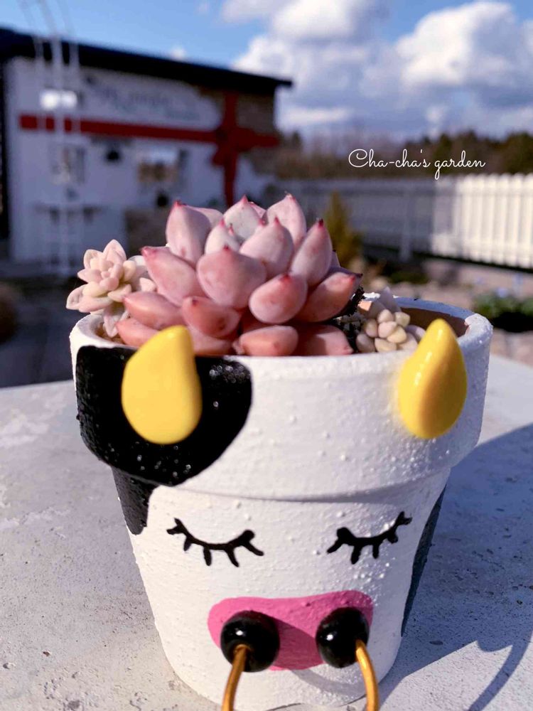 @茶々のお庭さん今晩は🌃可愛いモーモーの鉢、手作りですか❓
