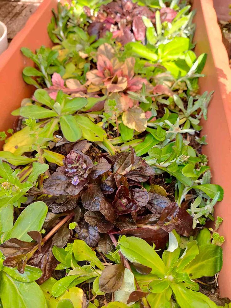 多分、アジュガのダークマホガニー?と、マルチカラーっぽいですね。マルチカラーは斑がピンクのものとか出てきて一気に華やかになりました。