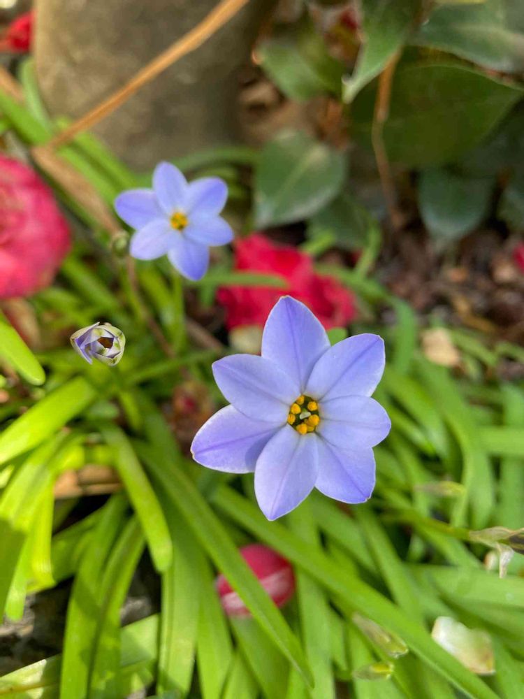 青色のハナニラも開花です。株数は少ないのでこれだけ、後ろの赤いのは、ツバキの落花です。