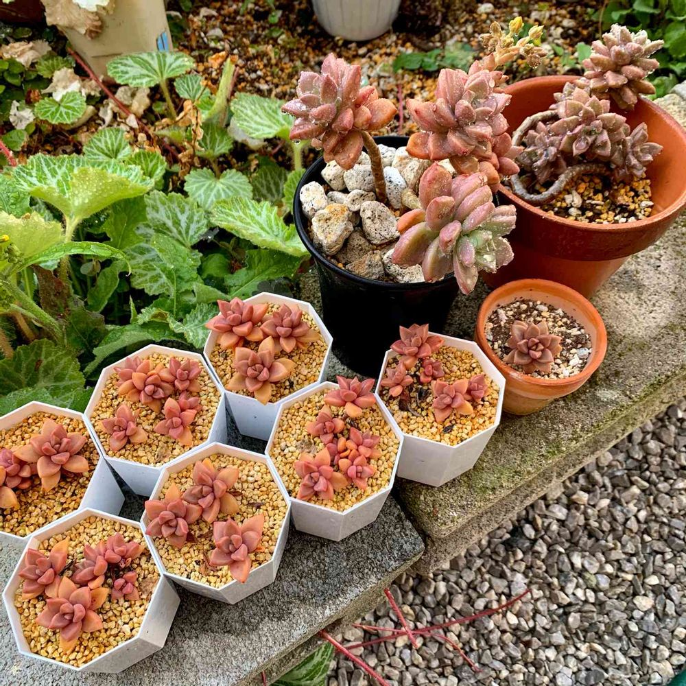 左側の7個は葉挿し鹿沼土オンリーで育てて右の小さい鉢はブレンドの土使ってます😙
