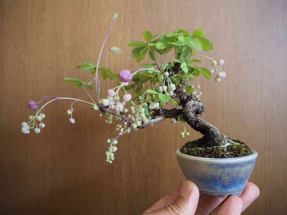 山でこの白い花見かけます(アケビですね) 盆栽でも、アケビの実は成るのかしら。とても興味深いです😍