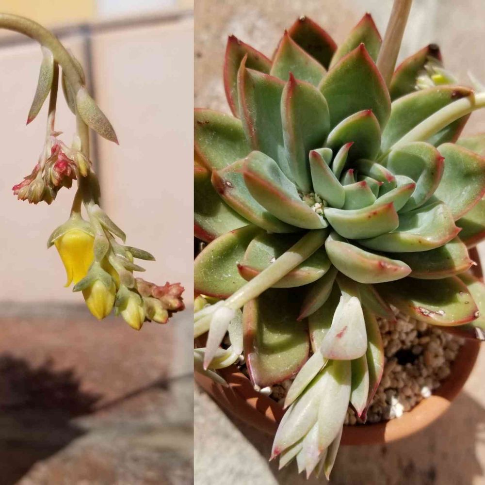 以前、名前教えてで投稿したエケベリアさん、やっとお花が咲きました。つぼみはピンクに見えたのですが、咲いたら黄色でした🌼アガボイデスクリスマスにそっくりなお写真があったので、アガボイデスクリスマスとしようと思います。
