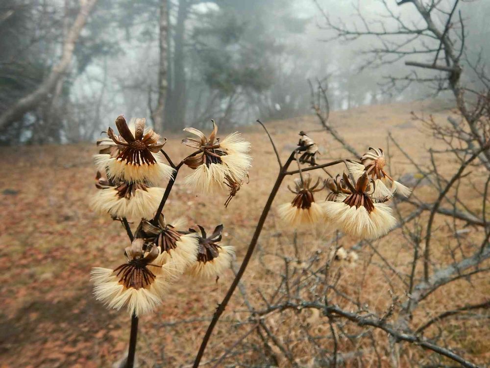 撮影したのは天子山脈の最高峰にあたる毛無山の山頂近くになります。ガスが降りる中で、マルバダケブキの綿毛をつけた姿が不思議に印象に残りました🤗