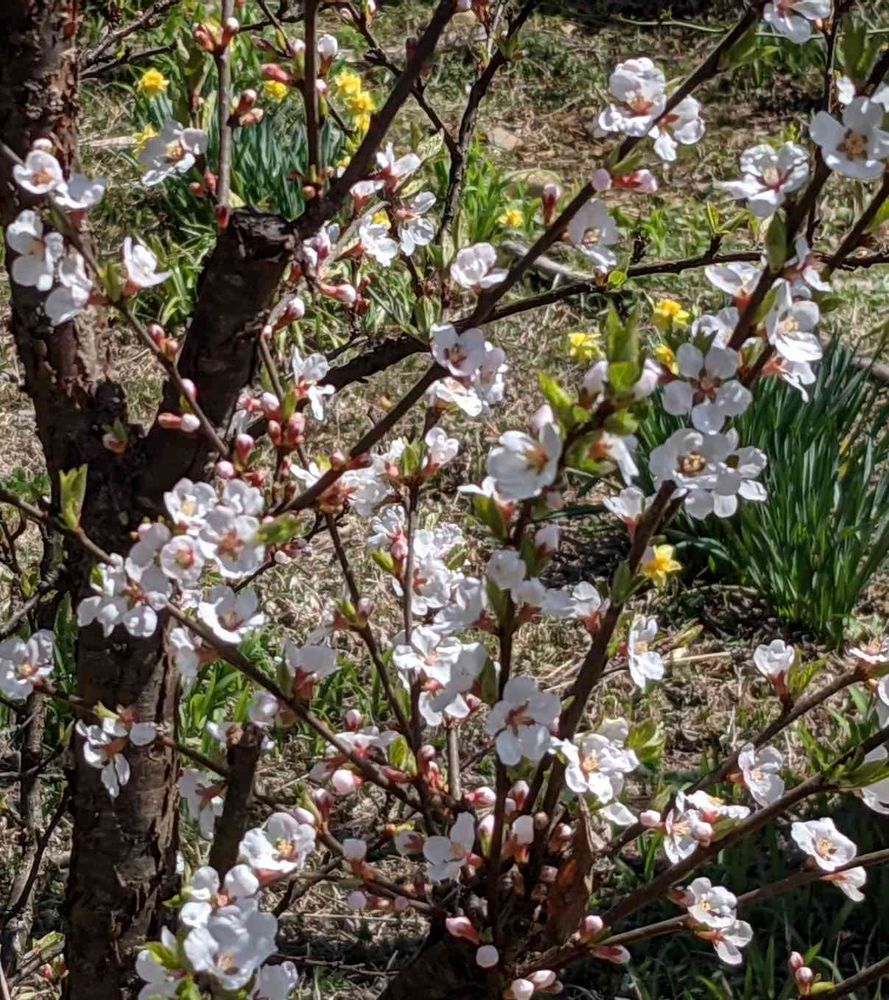 ユスラ梅も満開に近づいています。向こうに水仙も咲いて、4月を待たずしてもう春爛漫です。