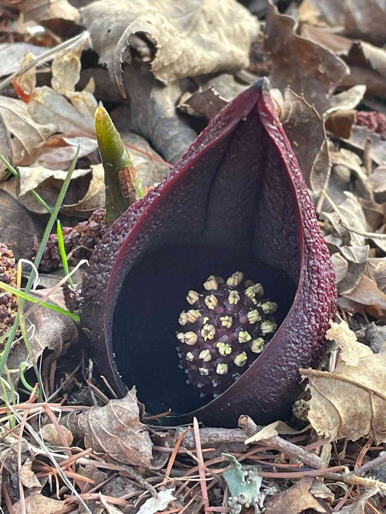 たしかに岩穴で僧侶が坐禅を組んでいるような花序に見える。この時期、まだ訪花昆虫が少ないので、呼び込むために花を含めて全草に悪臭がするようだ。英語では露骨にスカンク・キャベツと命名されている。