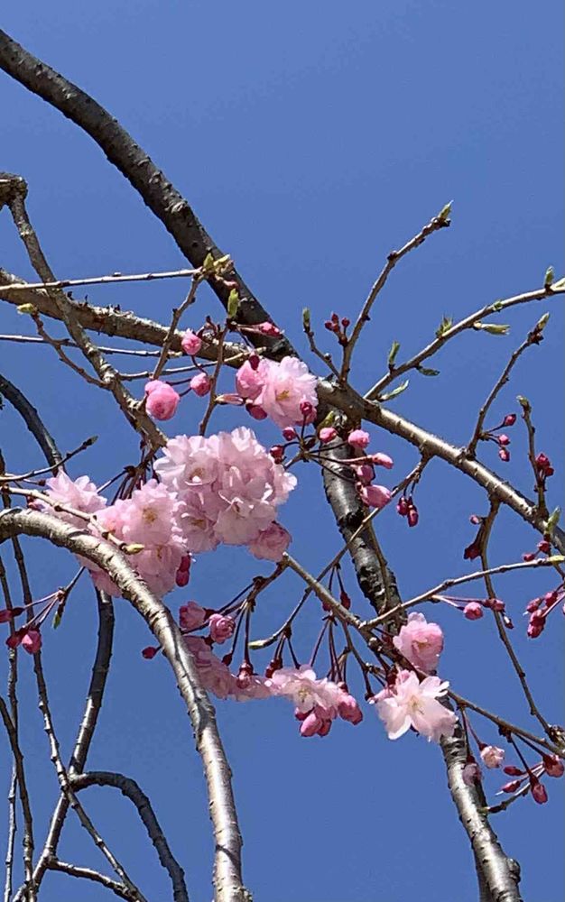 八重の枝垂れ桜🌸もう咲いているのですね!青空に淡いピンク色が映えます💗👍