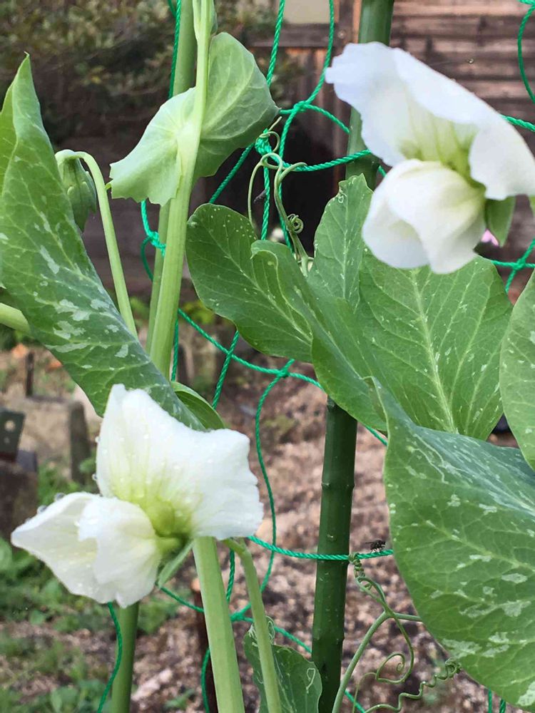 えんどう豆のお花、たくさん咲いています💕花もですが、葉の模様もきれいだと思います😊