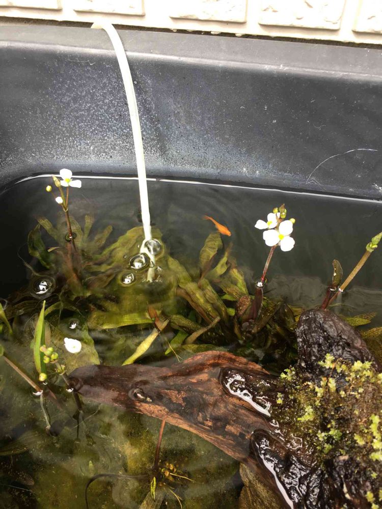 白い花の水草は 確かオモダカと云うのでした!非常に丈夫な草です、根がどんどん伸びてすぐに広がってきますよ!