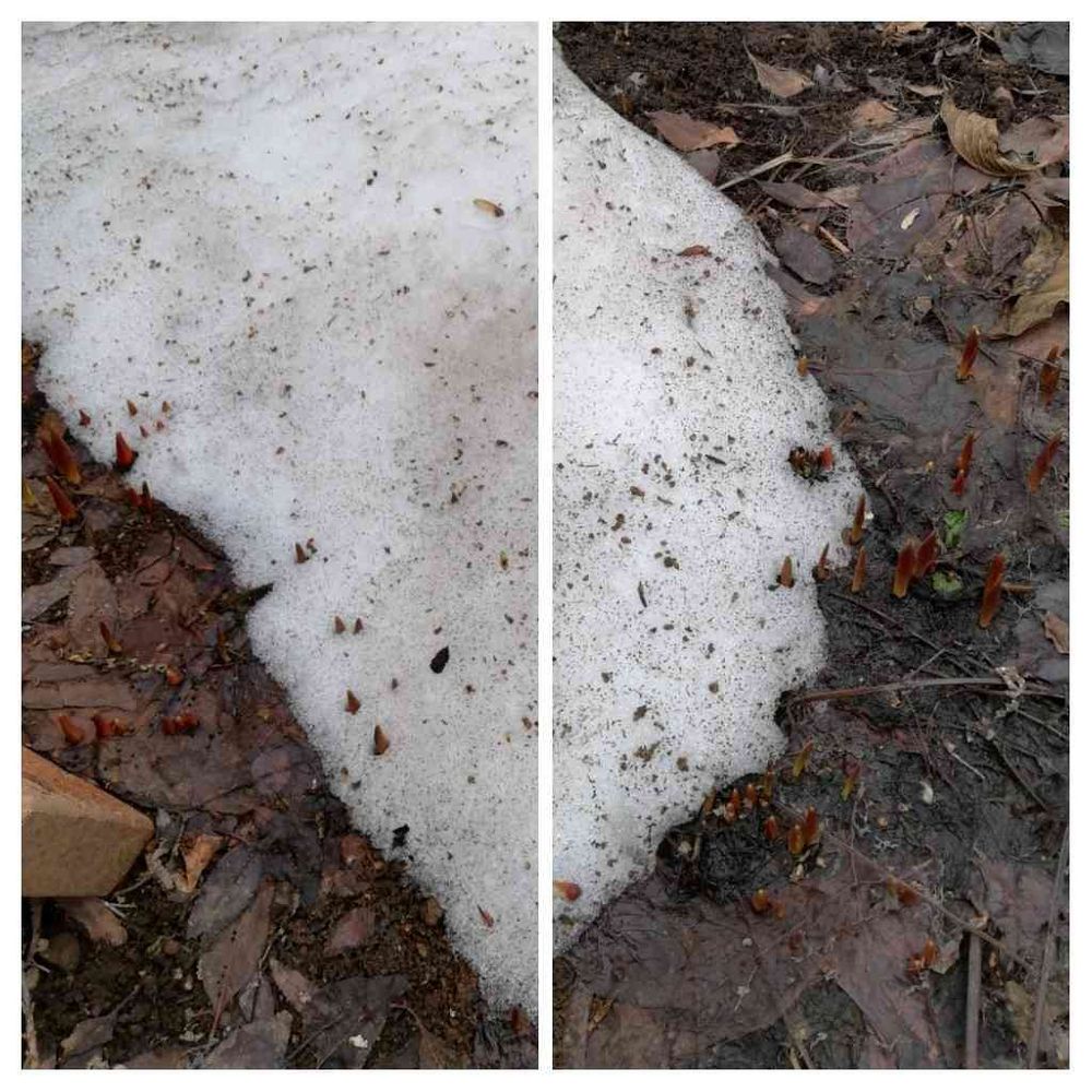 1日でほとんど、雪がとけました。チューリップ🌷と水仙とクロッカスとシラーが同時に芽を出した感じになりました。開花時期はどうなることやら?びっくり👀ポン‼️