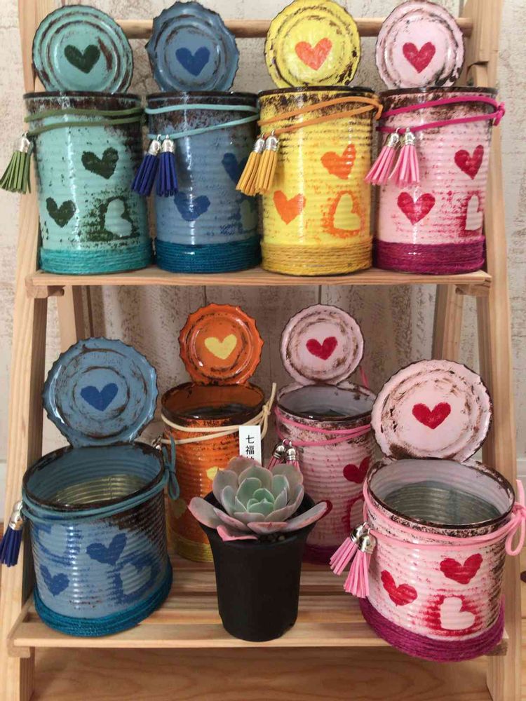 ハートがいっぱい!可愛いリメ缶たくさんですごいな〜(●≧з≦)っ⌒♡