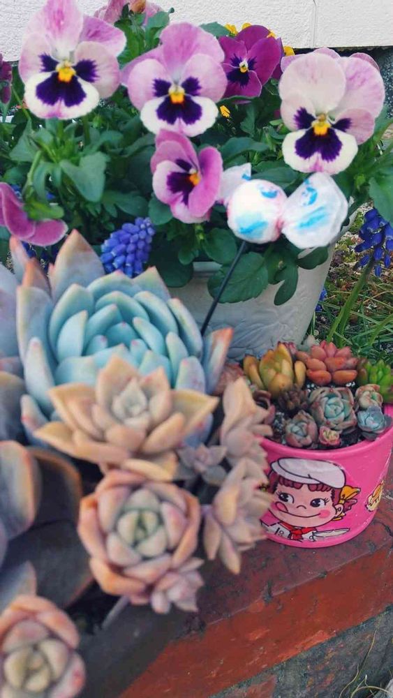 綺麗に咲いたパンジーさんと多肉さんの中に可愛いピンクのペコちゃん鉢ですね(*ฅ́˘ฅ̀*)💗