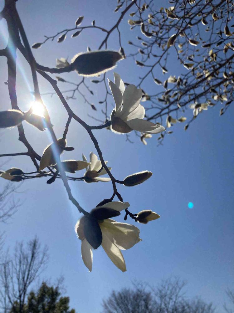 コブシは完全に開いていろんな方向に咲くのに対しモクレンは完全には開かず上を向いて咲くのだとか。