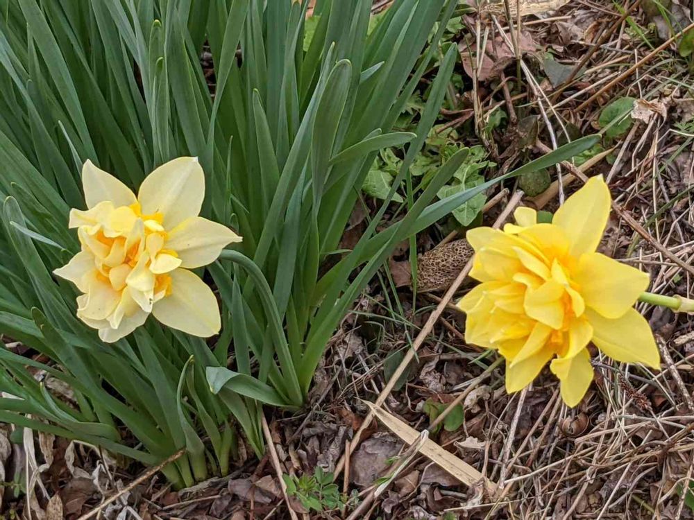 自生の?八重咲きの水仙…③ 右の株だけ色合いが違います。庭中でこの株だけなんです。この株を変異株と言いますか??…この株全体が咲いて来たら同じ色かどうか確認しますね。