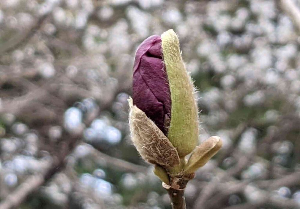 紫木蓮の蕾、色が出て来たものもあります。後ろは白く小さいお花の富士桜。両方とも右手にある小屋に似合うように植えました。ただ欲しかった昔ながらの紫木蓮が探せず、少し赤みがかった種類で妥協しました。