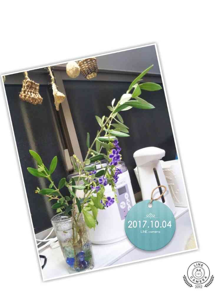 剪定したオリーブともう終わりかけのデュランタをキッチンの出窓に飾りました😊