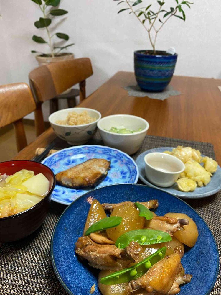 今日は鶏肉と大根の煮物の他に焼きホッケ、長芋ときゅうりの酢物、百合根の天ぷら、キャベツとじゃがいも、油揚げのお味噌汁(自家製味噌)玄米ご飯です。