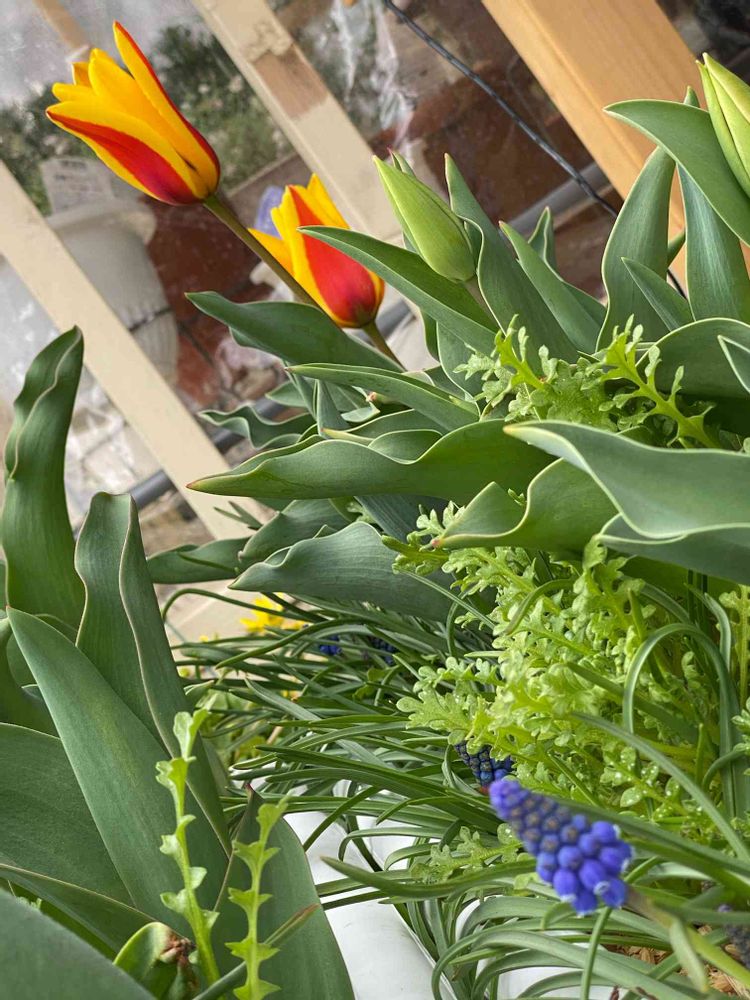 チューリップとムスカリが咲き始めました💛❤️💙少しだけ取れたネモフィラの種をパラパラしておいたら、間から芽吹いています(❁´꒳`❁)