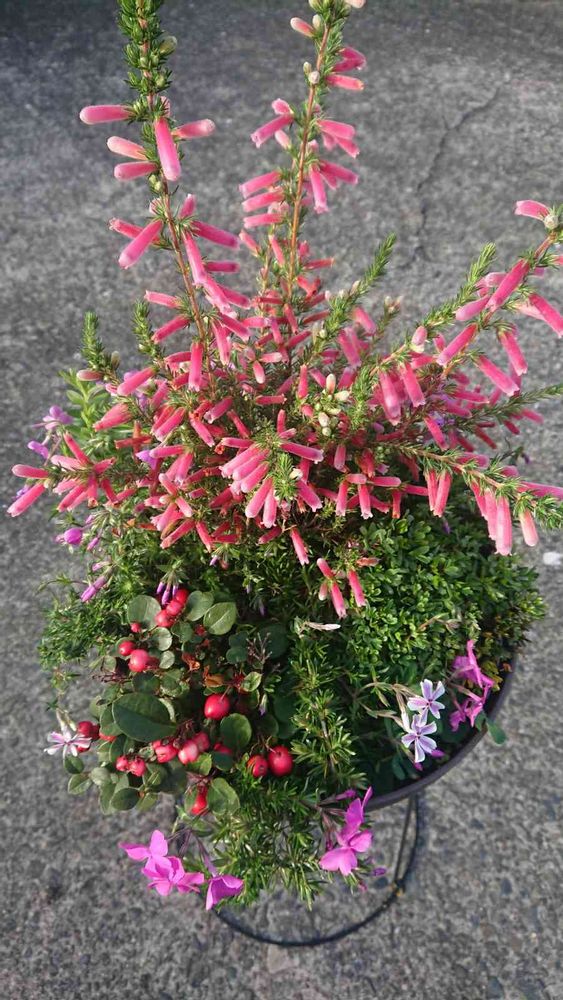 エリカ チェッカーベリー オキザリス 芝桜二種 今や我が物顔で鉢の中で主張しています。🤗💕💕