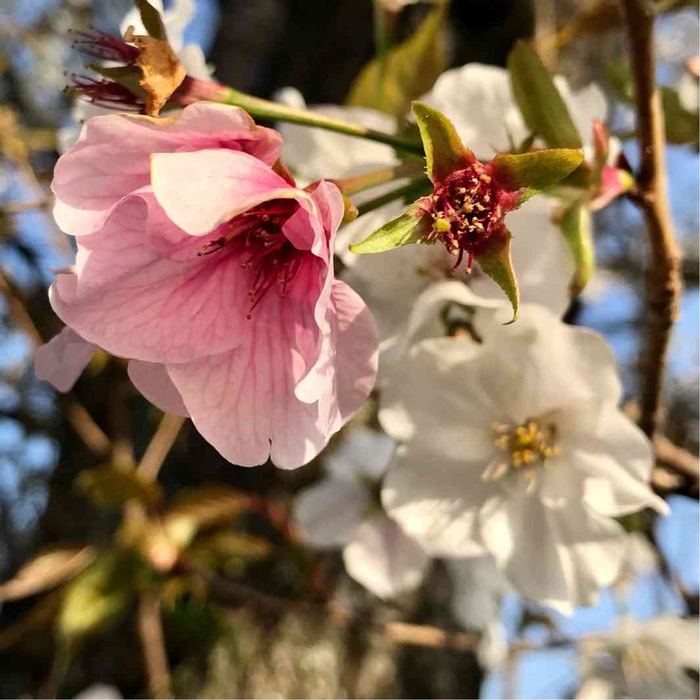 同じ木から、ピンク色と白色の桜が咲いています🌸