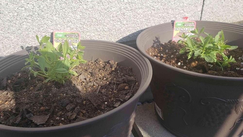 1,5メートルになるよう、育てようという、チャレンジ。私も育てたくなり、似たような大きさの苗を、買ってみました。土を変えて、チャレンジしてみようかと、左は、リサイクルのオリジナル土。右は。園芸やさんのオリジナル土。