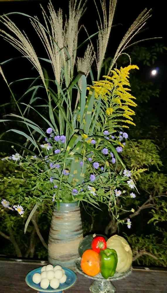 母が張り切ってススキをいけてお団子作って「月が🌕見えるうちに📷撮って❗」